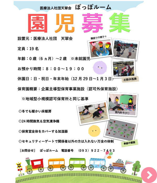 | 施設名称 | 医療法人社団天翠会保育所 ぽっぽルーム(企業主導型保育所) |