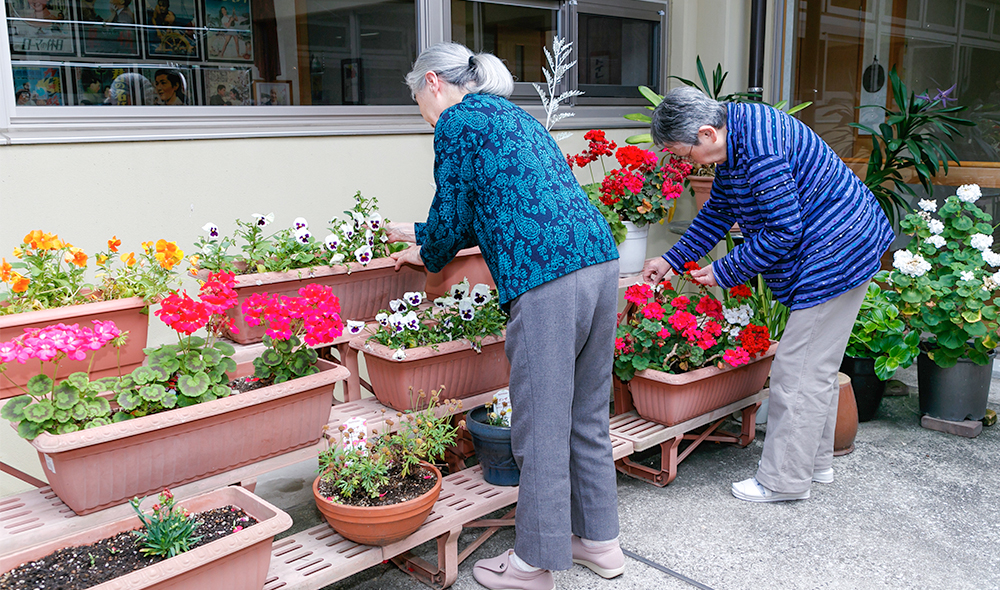 スタッフと一緒に洗濯、掃除、中庭のお手入れをしたり、天気が良い日には、